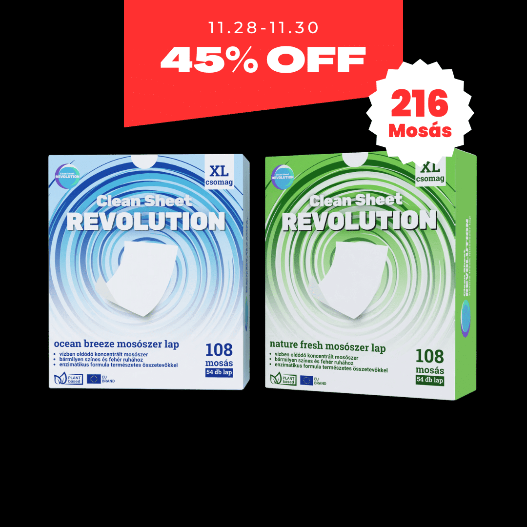 A Clean Sheet Revolution mosószer lapok a mosószerek új generációját képviselik. A csomagban 1 darab Ocean Breeze mosószer lap termék található színes ruhákhoz és 1 darab Nature Fresh mosószer lap termék található világos és fehér ruhákhoz. A csomag több mint 2000 Ft-tal kedvezőbb áron kínálja a termékeket, mint külön vásárolva, illetve akár 216 mosási töltethez elegendő mosószert biztosít. Ideális első vásárlóknak, akik így kedvezményes áron próbálhatják ki mindkét terméket.